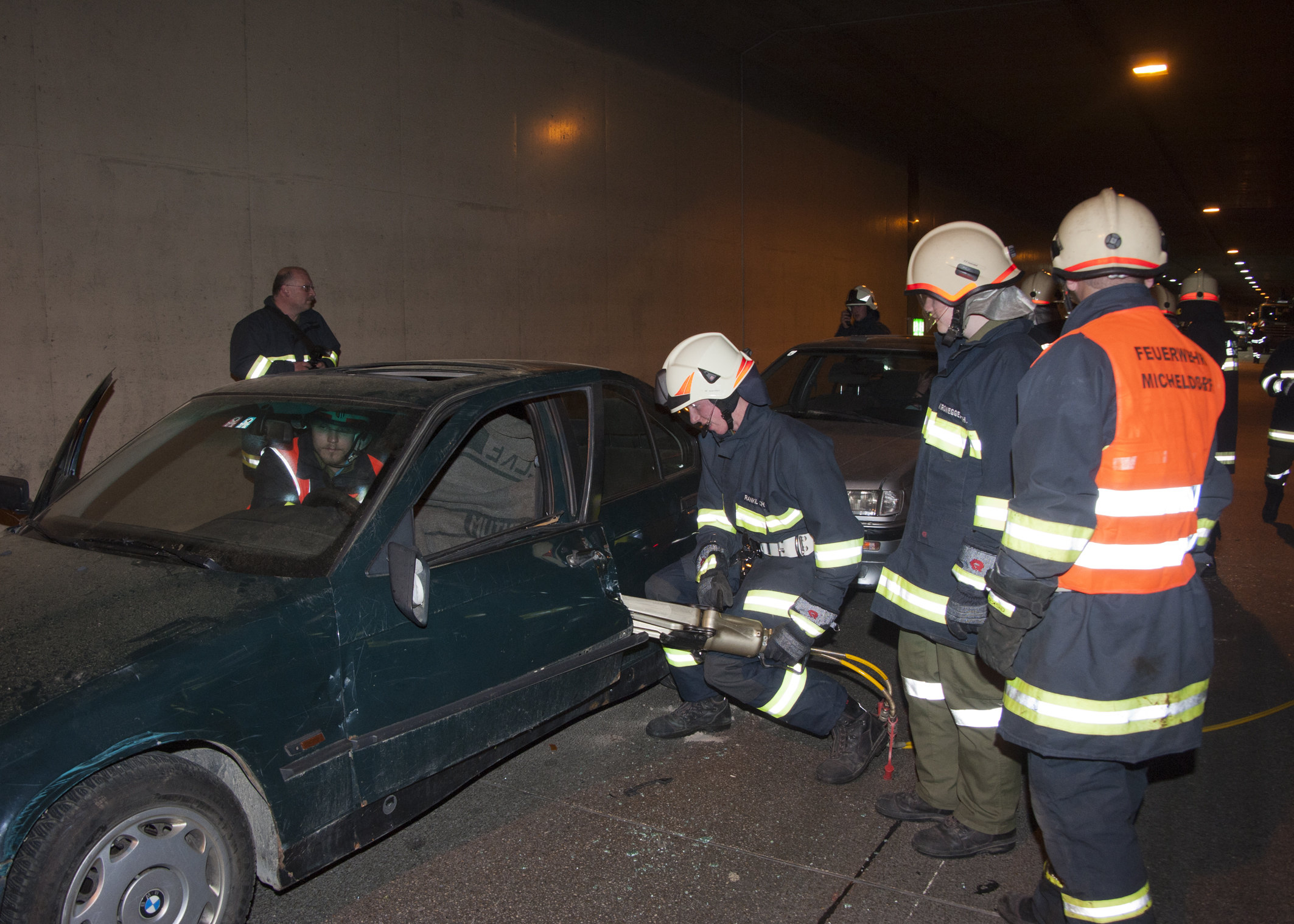 Übungsannahme war ein Verkehrsunfall mit eingeklemmten Personen in 4 Fahrzeugen auf der A9 im Tunnel Ottsdorf, Fahrtrichtung Passau bei km 21,257. Die Fahrzeugen beginnen zu brennen. Die Unfallstelle wird von der Feuerwehr lokalisiert und der Brand gelöscht. In den Fahrzeugen sind Personen eingeklemmt, welche von der Feuerwehr mit dem hydraulischen Rettungsgerät aus den Fahrzeugen befreit werden müssen. Die verletzten Personen, werden von der Feuerwehr geborgen und dem Roten Kreuz zur Erstversorgung übergeben, die in der nicht betroffenen Tunnelröhre eine Notlager aufgebaut hatten. Der simulierte Rückstau erschwerte die Arbeiten. Aus dem im Stau stehenden Fahrzeugen flüchten mehrere Personen in den Notausgang auf die andere Röhre. Diese wurden von den Einsatzkräften aufgefunden und betreut. Die Autobahn Polizei Klaus beteiligt sich neben der Verkehrsableitung an der Unfallaufnahme.