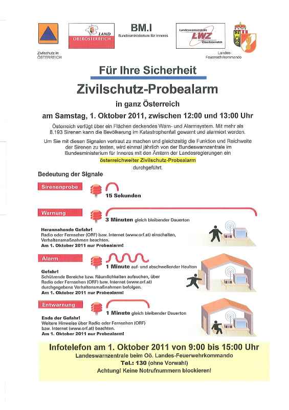 Am Samstag, den 01. Oktober 2011, wird wieder ein bundesweiter Zivilschutz-Probealarm durchgeführt. Zwischen 12.00 und 13.00 Uhr werden nach dem Signal „Sirenenprobe“ die drei Zivilschutzsignale „Warnung“, „Alarm“ und „Entwarnung“ in ganz Österreich ausgestrahlt.