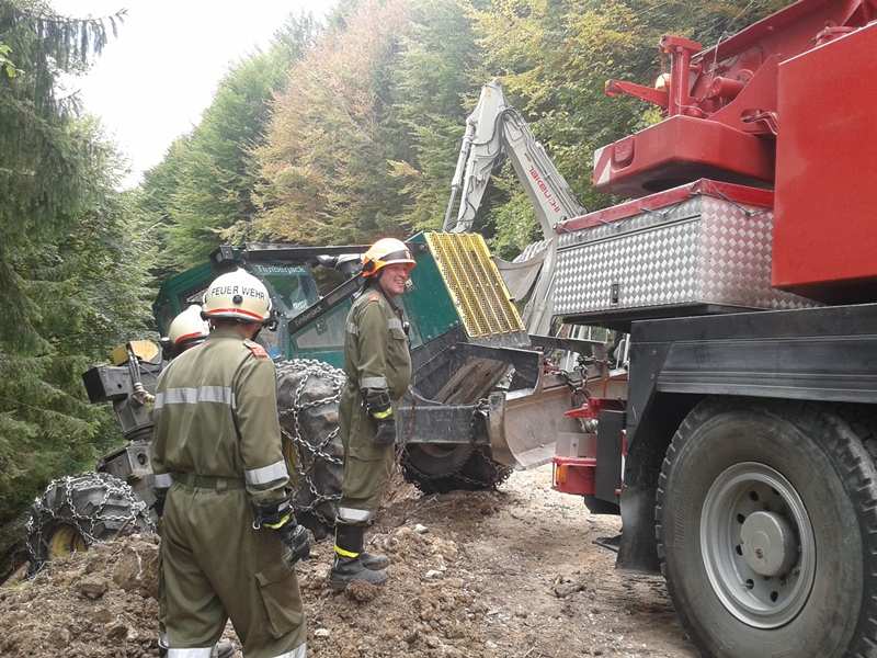 Am 31. Juli 2013 wurde der technische Zug kurz vor Mittag zu einer Hilfeleistung in die Steyrling alarmiert. Ein Timberjack (Forstfahrzeug), ist im Seilwindenbetrieb talwärts gezogen worden, abgerutscht und nach einigen Metern zum Glück an Bäumen hängen geblieben. Mit einem Bagger wurde der Standplatz für den Kran vergrößert um einen geraden Zug zu erreichen. Weiters die Kante zur Forststraße abgerundet damit ein "raufsteigen" des Fahrzeuges auf die Straße sicherer möglich ist. Mit der Kranseilwinde konnte das 18to schwere Gerät wieder auf die Forststraße gezogen werden. Die SRF Seilwinde sicherte mit einer Umlenkung am Bagger das Fahrzeug während der Bergung.