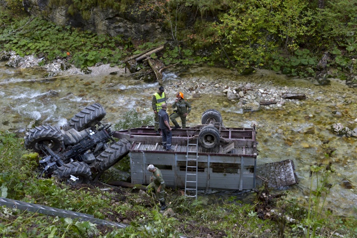 AM 27 Sept. 2014 ist im Bodinggraben ein Traktorgespann mit Kalbinen mit einem Überschlag in den Bach gestürzt. Der Fahrer wurde dabei zum Glück nur leicht verletzt. Die Kalbinen waren bis auf Eine nicht verletzt. Die FF Breitenau und FF Molln wurden zu diesem Unfall alarmiert. Der SRF Micheldorf war diesen Tag in Molln zur Präsentation und wurde gleich mitgezogen. Mit dem Ladekran konnte schweres Gerät in den Graben gehoben werden und Material wie die Motorflex wurde eingesetzt. Zur Bergung erfolgte die Nachalarmierung des technischen Zug Micheldorf. Das Gespann wurde getrennt und der Anhänger mit dem Kran herausgehoben. Den Traktor stellten wir mit der SRF Seilwinde auf und mit der KR Seilwinde konnte er aus gem Graben gezogen werden. Die tote Kalbin wurde auch geborgen und auf einem Anhänger verladen.