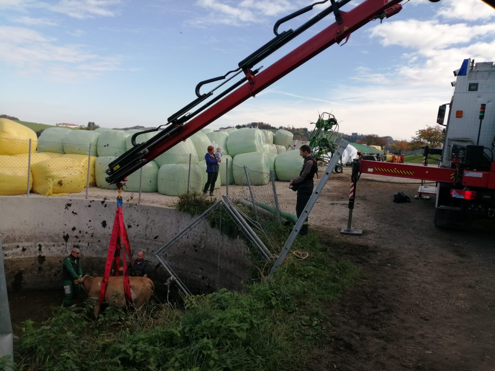 In Oberschlierbach hatte eine Kuh die Umzäunung der Güllegrube durchbrochen und ist ca 4m in die leere Güllegrube gestürzt. Durch den schlammartigen Rest wurde der Aufprall gedämpft und die Kuh blieb sie unverletzt. Sie stand am Boden im Schlamm. Mit dem Ladekran des SRF und breiten Hebegurten wurde sie sicher aus der Grube gehoben. Nach der Reinigung marschierte sie geradeaus in den Stall und suche sich einen ruhigen Platz nach dieser Aufregung. Also der Milchnachschub ist gesichert.