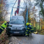 Gemeinsam mit dem WLF-K2 KS und den Kameraden der Feuerwehr Nußbach konnte das Fahrzeug behutsam aufgerichtet und aus dem Graben gezogen werden.