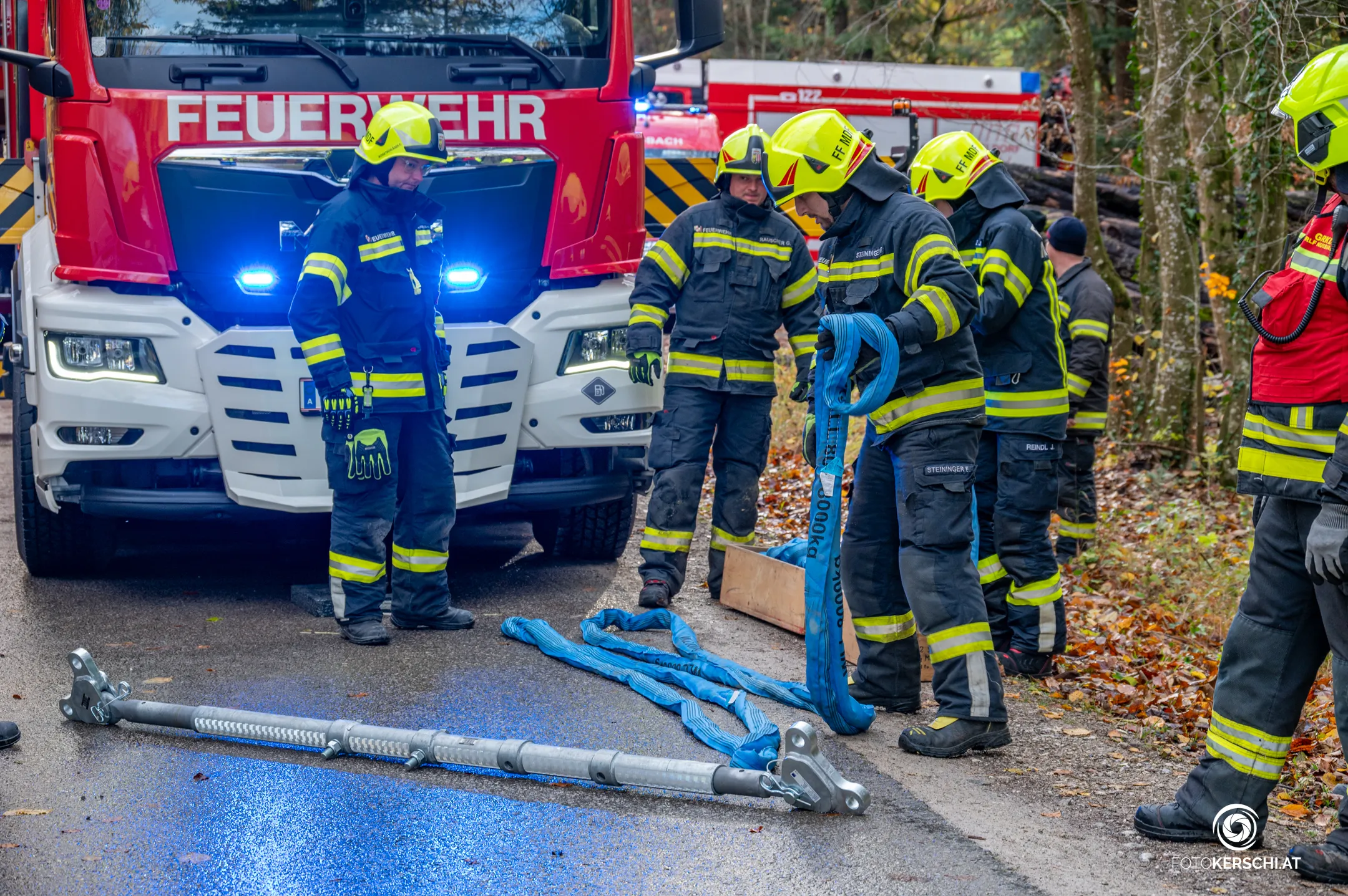 Gemeinsam mit dem WLF-K2 KS und den Kameraden der Feuerwehr Nußbach konnte das Fahrzeug behutsam aufgerichtet und aus dem Graben gezogen werden.