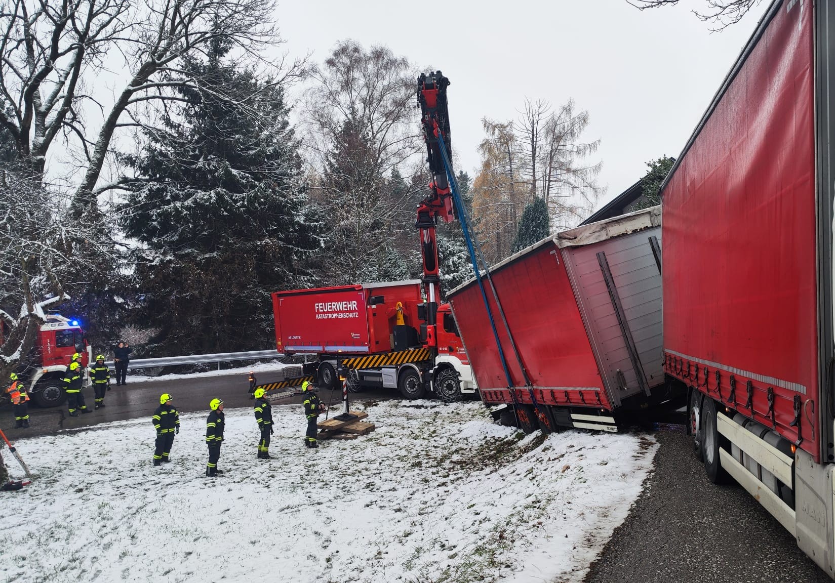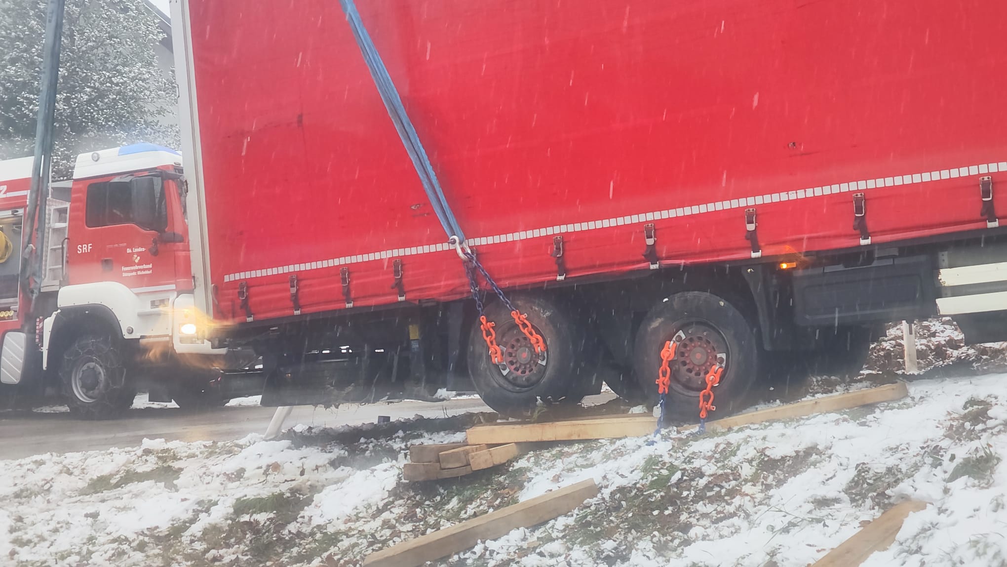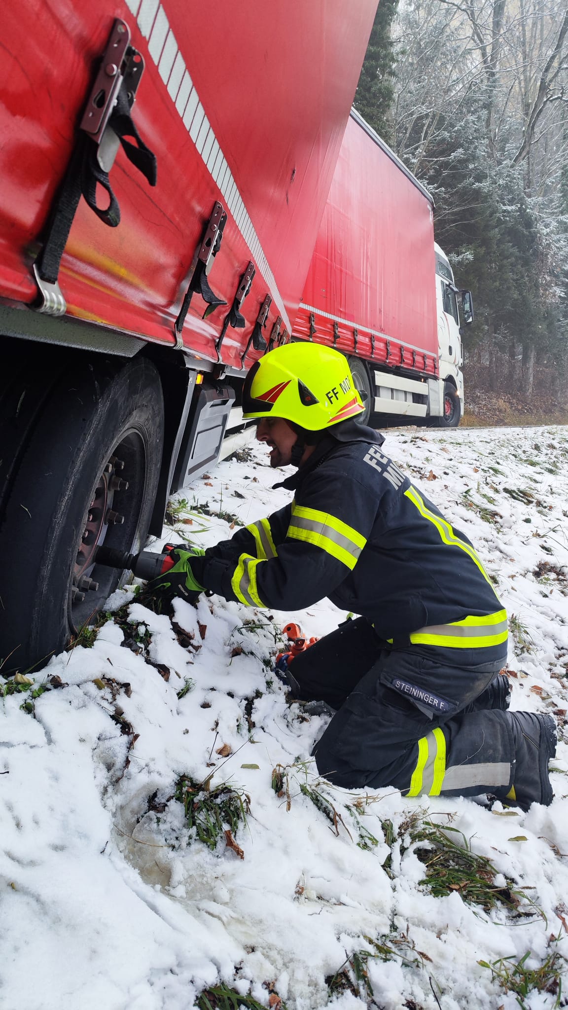 Nur wenig später, um 07:13 Uhr, erfolgte die nächste Alarmierung – erneut zu einer LKW-Bergung. Ein Lastwagen war mit dem Anhänger von der Straße abgekommen und drohte umzustürzen. Am Einsatzort sperrten wir die Straße und unterstützten die Sicherungs- und Bergungsmaßnahmen. Mit unserem WLF, der Seilwinde des SRF sowie durch die Mithilfe des LKW-Lenkers wurde der Anhänger stabilisiert, mit Holz unterlegt und schließlich wieder auf die Fahrbahn gezogen.