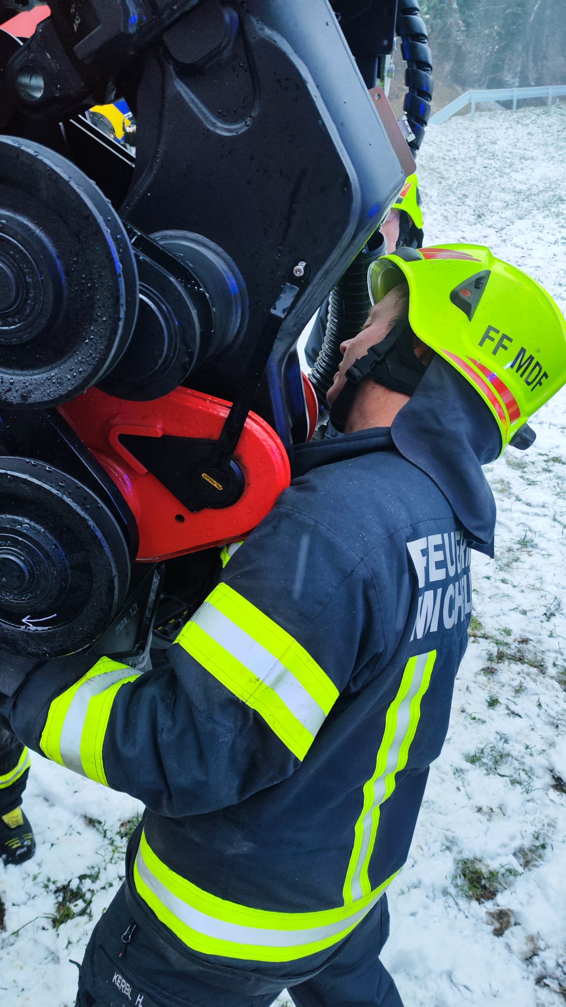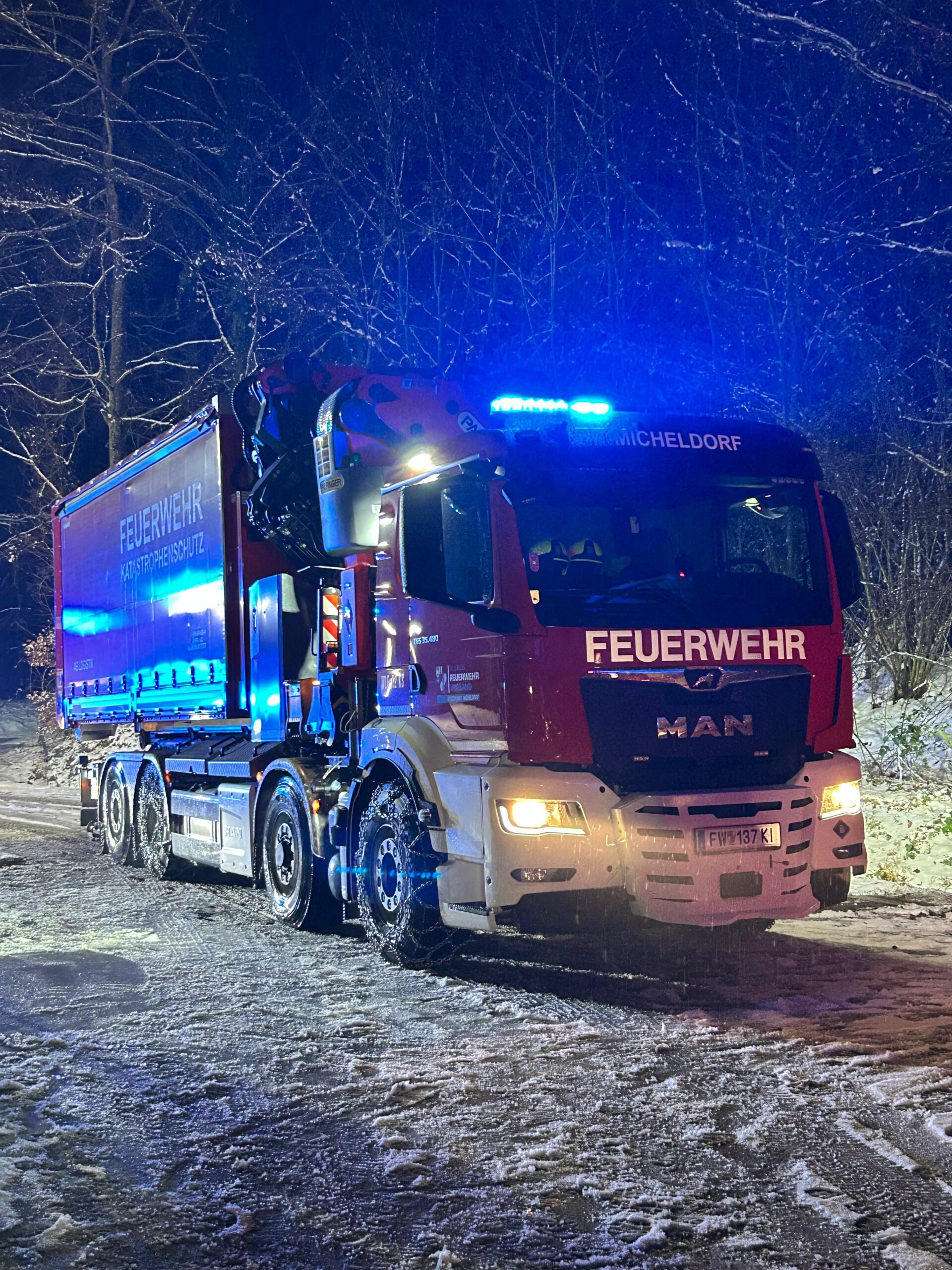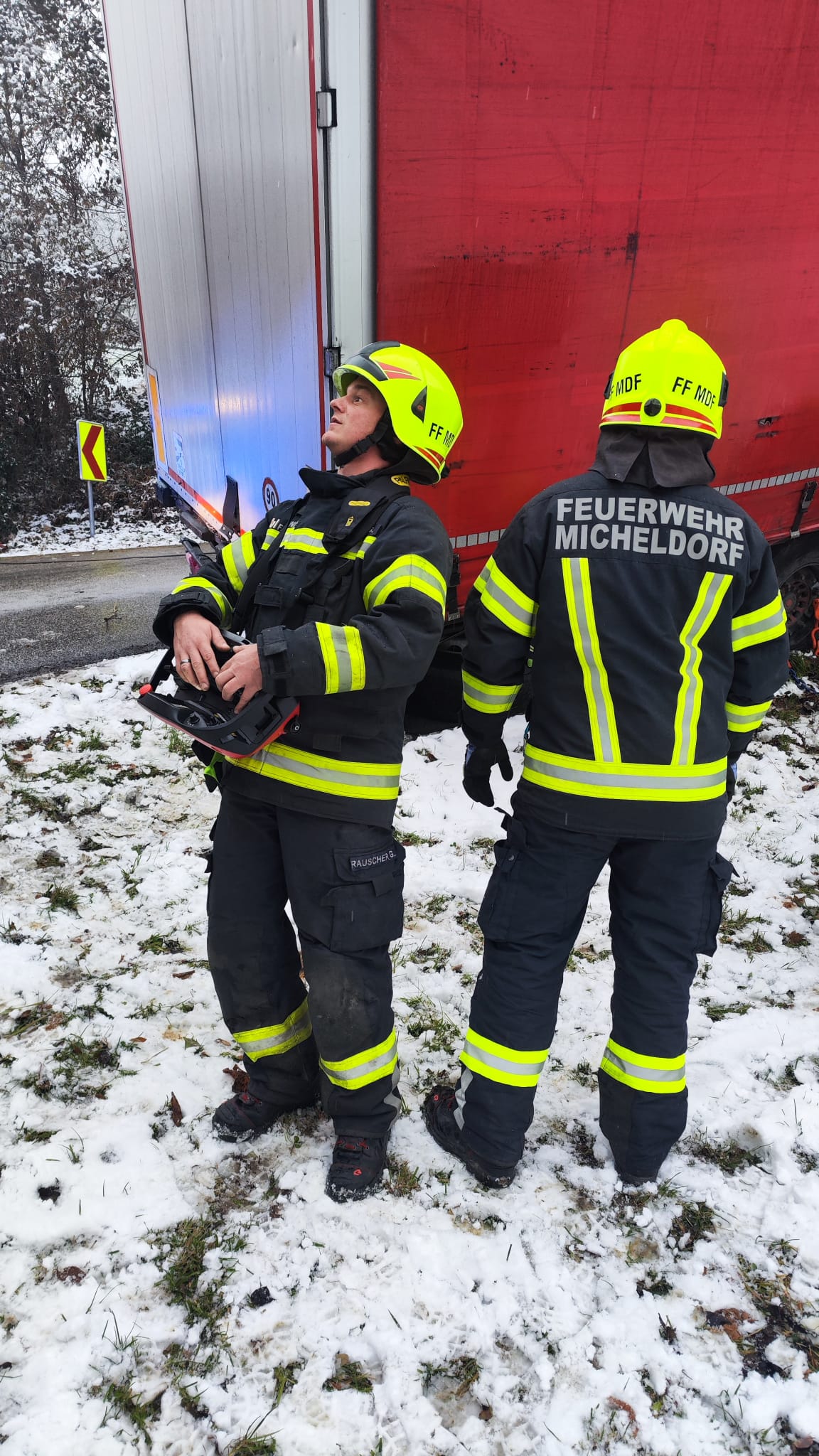 Nur wenig später, um 07:13 Uhr, erfolgte die nächste Alarmierung – erneut zu einer LKW-Bergung. Ein Lastwagen war mit dem Anhänger von der Straße abgekommen und drohte umzustürzen. Am Einsatzort sperrten wir die Straße und unterstützten die Sicherungs- und Bergungsmaßnahmen. Mit unserem WLF, der Seilwinde des SRF sowie durch die Mithilfe des LKW-Lenkers wurde der Anhänger stabilisiert, mit Holz unterlegt und schließlich wieder auf die Fahrbahn gezogen.
