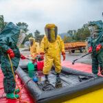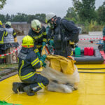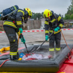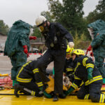 Unsere Feuerwehr übernahm dabei die Aufgabe, die DEKO-Straße zu betreiben. Drei unserer Atemschutzträger arbeiteten im roten Bereich mit Schutzanzügen. Sie reinigten die eingesetzten Kameraden, die direkt im Gefahrenbereich tätig waren, und wuschen sie fachgerecht von den simulierten Chemikalien ab.