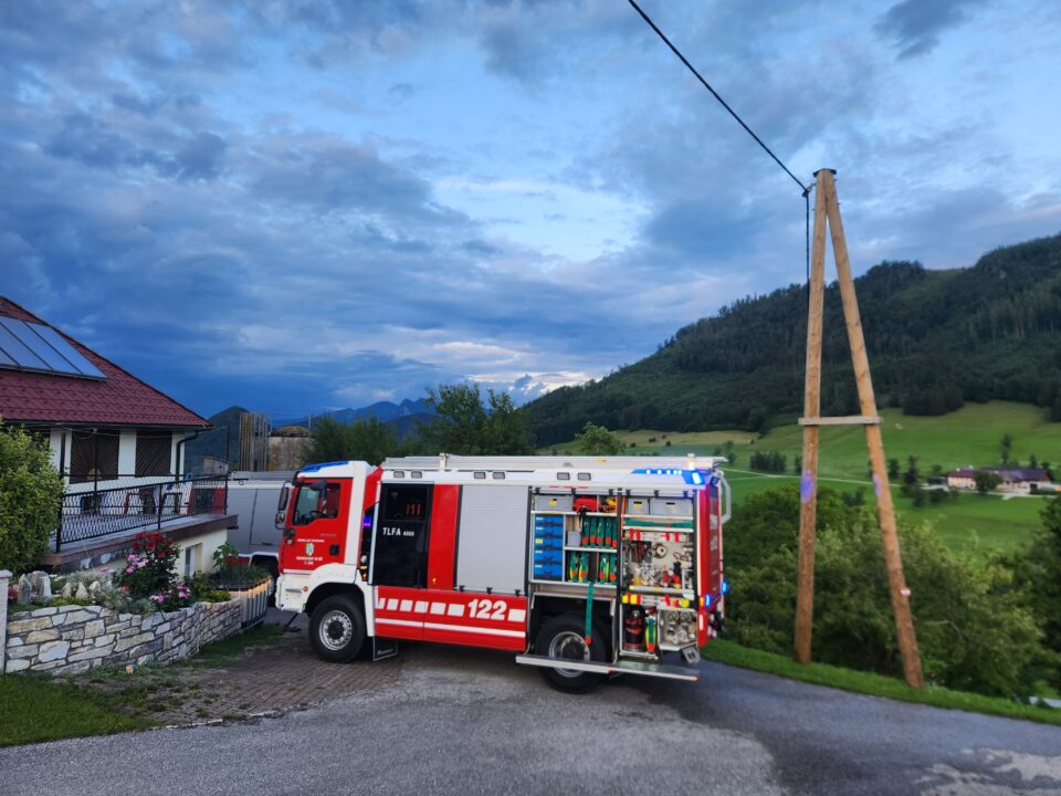 Bereits während der Anfahrt wurde durchgegeben, dass sich der Sammelplatz beim Feuerwehrhaus Altpernstein befindet. Unser Tank 2 fuhr direkt zum angenommenen Brandobjekt weiter und begann umgehend mit dem ersten Löschangriff mittels C-Rohr.