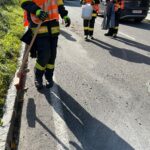 Wir begannen mit den Aufräumarbeiten und kümmerten uns vorrangig um die ausgelaufenen Betriebsmittel. Mit Besen, Schaufeln und Ölbindemittel wurde die Straße gereinigt. Anschließend unterstützten wir den Abschleppdienst beim Verladen des beschädigten Motorrads.