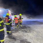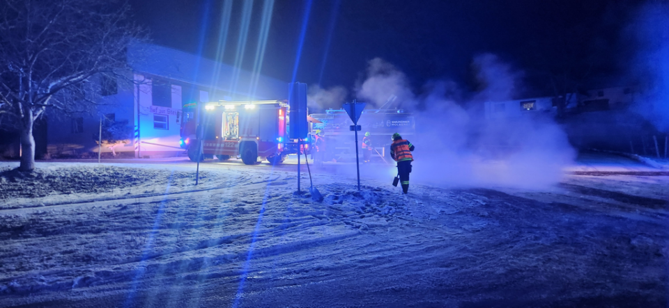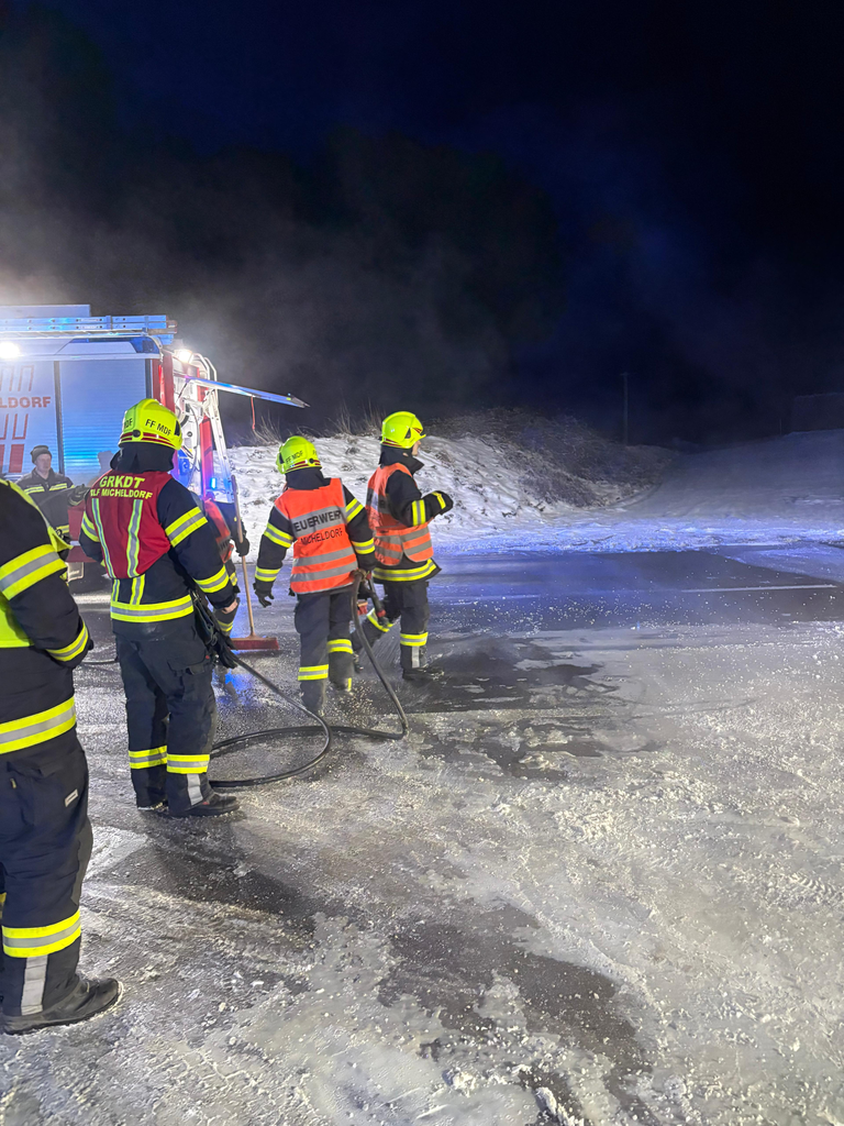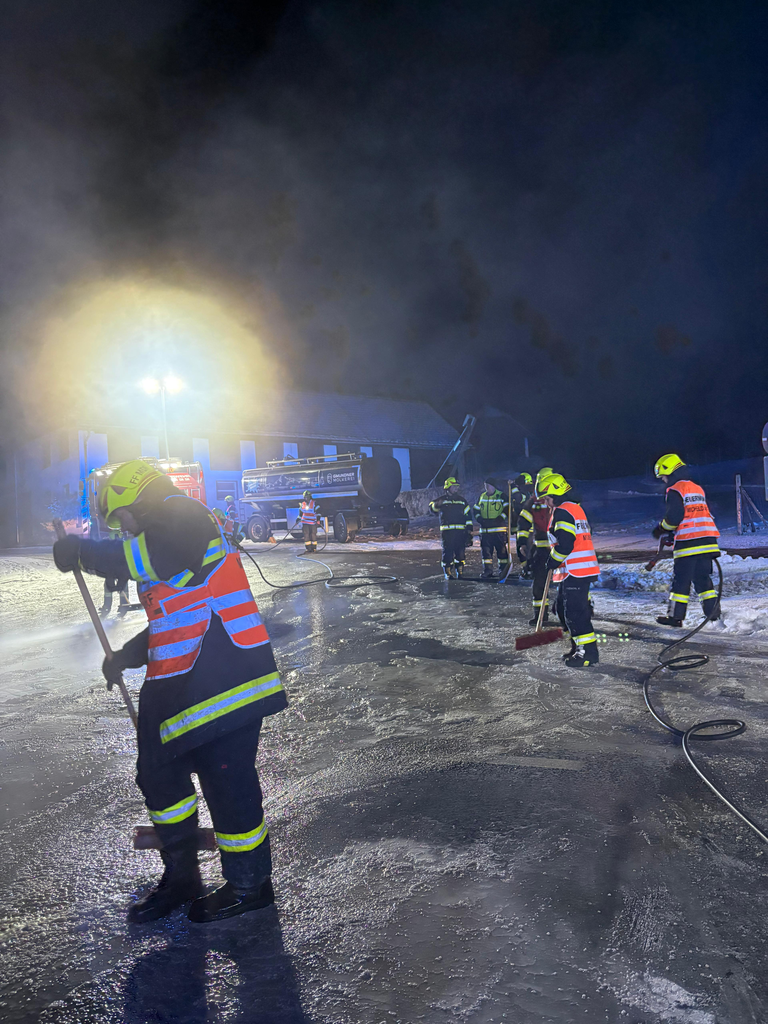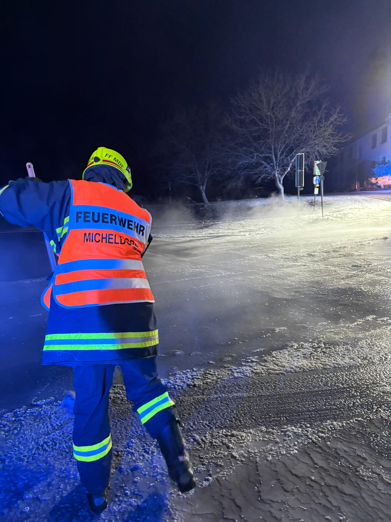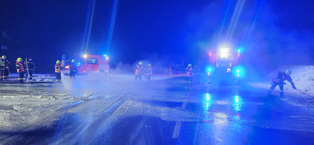 Mit unseren Tanklöschfahrzeugen spülten wir die verschmutzte Straße gründlich mit Wasser ab. In Zusammenarbeit mit der Straßenmeisterei wurde die Fahrbahn anschließend gesalzen, um die Verkehrssicherheit wiederherzustellen.