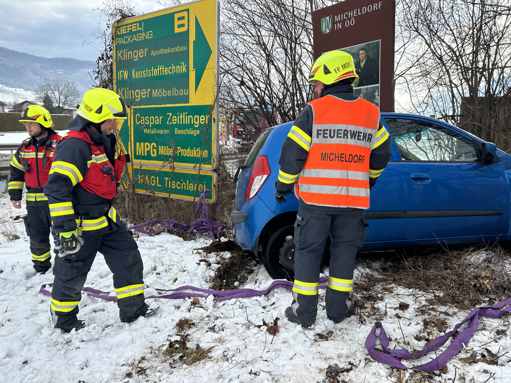 Beim Eintreffen am Einsatzort war die verunfallte Person bereits durch den Rettungsdienst aus dem Fahrzeug gerettet und in den Rettungswagen gebracht worden. In weiterer Folge setzten wir den Kran unseres SRF ein, um das beschädigte Fahrzeug aus seiner Lage zu bergen und auf einen Abschleppwagen zu verladen.