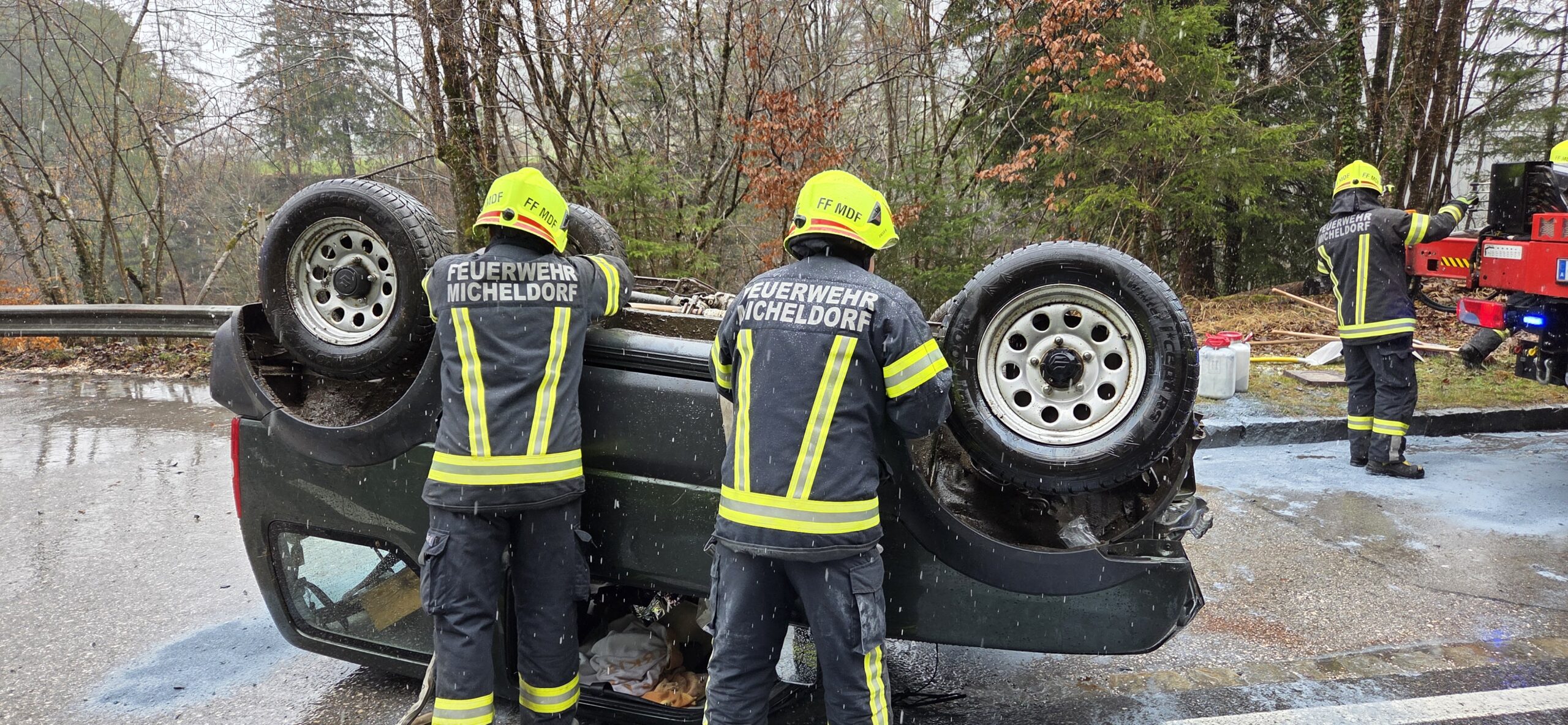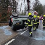Nach dem Eintreffen am Einsatzort wurde gemeinsam mit dem Einsatzleiter eine Lageerkundung durchgeführt und die weiteren Aufgaben festgelegt. Der PKW war aus noch ungeklärter Ursache nach einem Aufprall umgestürzt und auf dem Dach liegen geblieben. Die verunfallte Person wurde bereits vor unserem Eintreffen von Ersthelfern und der Polizei aus dem Fahrzeug befreit und dem Rettungsdienst übergeben.