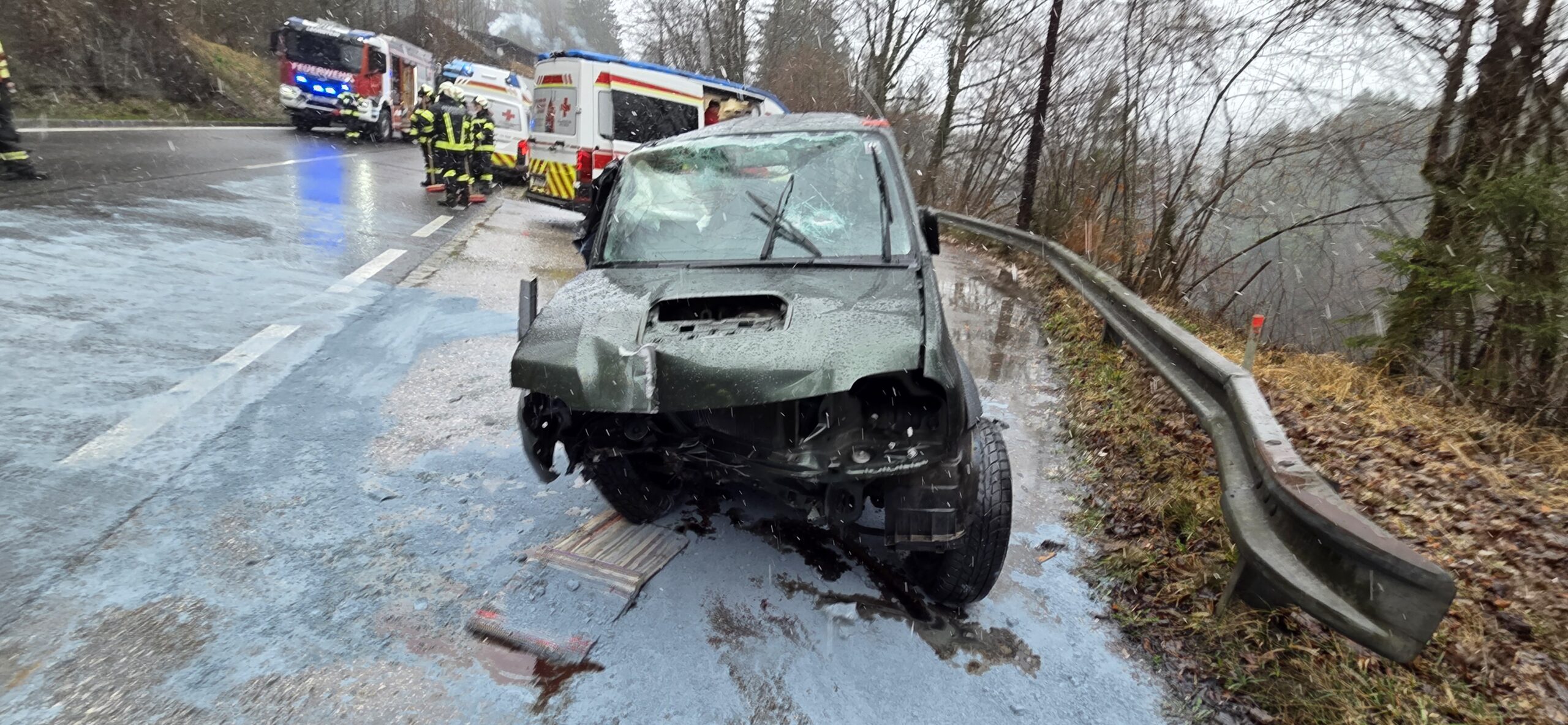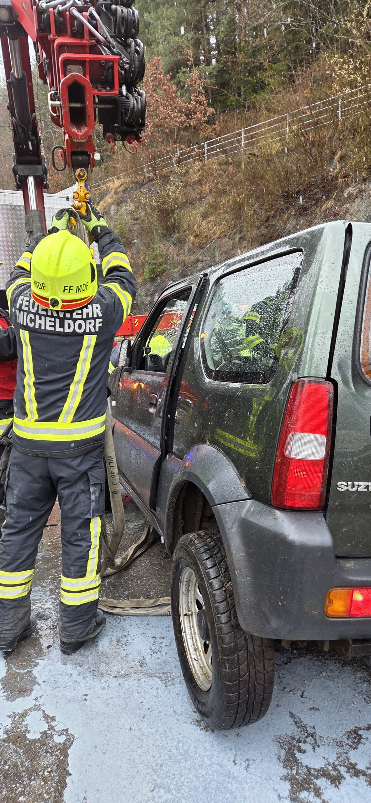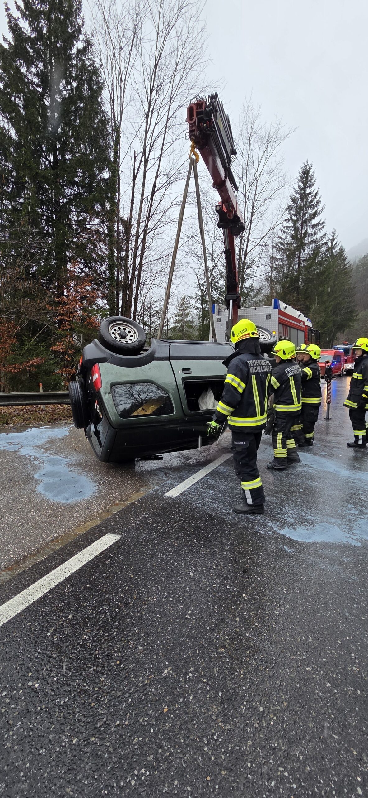 Unsere Aufgaben bestanden im Binden von ausgelaufenen Betriebsstoffen sowie im anschließenden Wiederaufrichten des Fahrzeugs. Mithilfe des Krans unseres SRF wurde der PKW wieder aufgestellt und am Straßenrand abgestellt. In weiterer Folge wurde das Fahrzeug in Absprache an die Straßenmeisterei übergeben und für den Abschleppdienst vorbereitet.